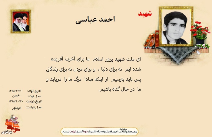 فرازی از وصیت نامه شهدا ۱۳ دی ۱۴۰۴ | ۱۰:۰۱ کد : ۵۷۴۶۹ اطلاعیه ارسال به دیگران نام شما ایمیل شما ایمیل دریافتکننده ارسال انصراف تعداد بازدید:۴۵۵ فرازی از وصیت نامه شهدا فرازی از وصیت نامه شهید بزرگوار احمد عباسی :